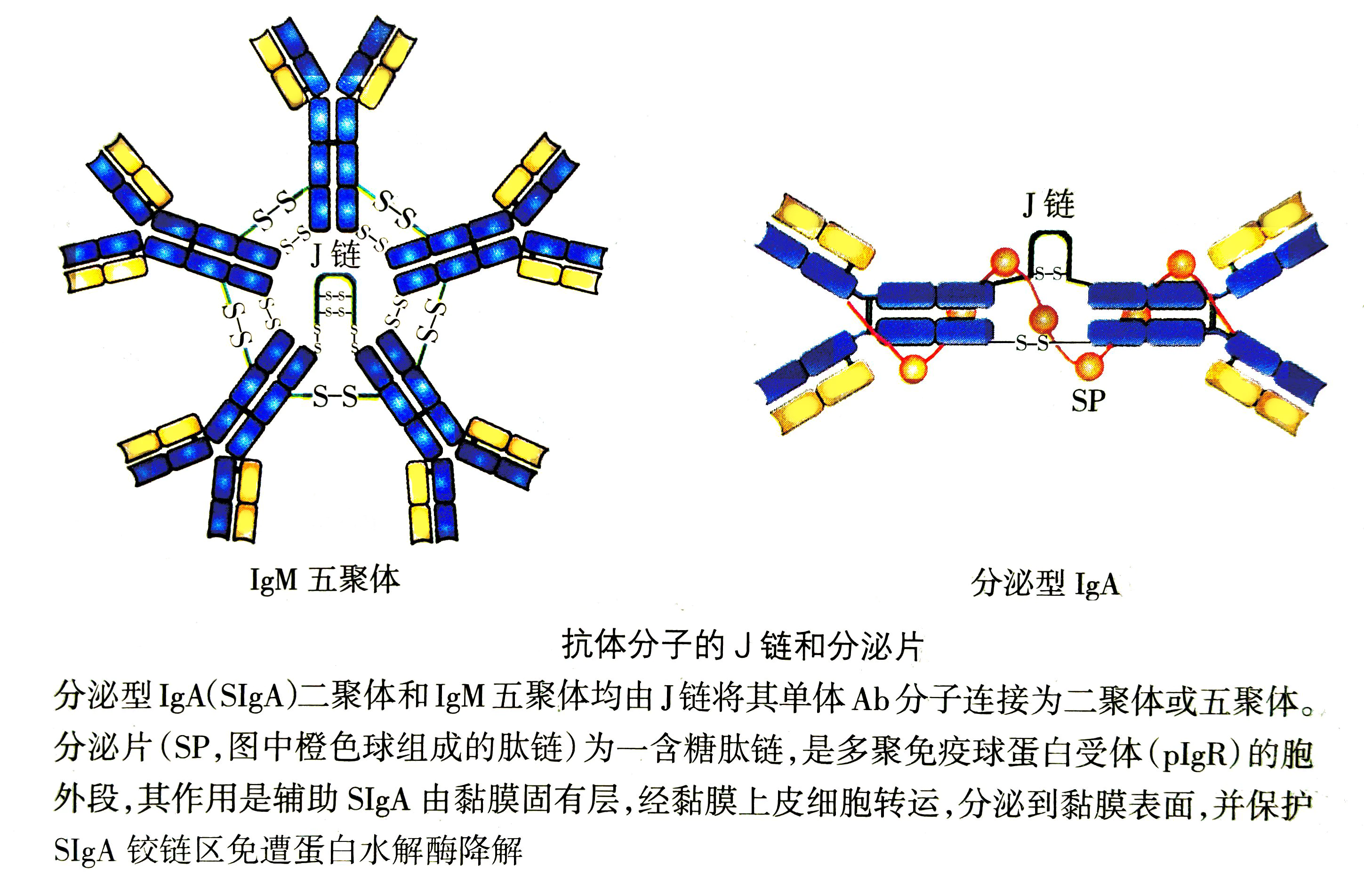 - 抗体的辅助成分:J 链(joining chain)、分泌片(secretory piece。SP)